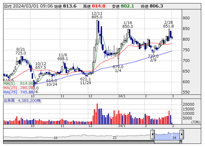 43. <2413> エムスリー 東証P 834 2192.5 ( +2.1 ) 日経225・JPX日経400採用