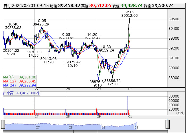 2024年03月01日09時20分 【市況】日経平均の上げ幅が300円突破 日経平均 <5分足> 「株探」多機能チャートより 日経平均株価の上げ幅が300円を突破。9時19分現在、345.86円高の3万9512.05円まで上昇している。 株探ニュース