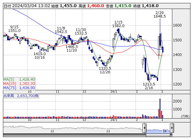 2024年03月04日13時01分 【材料】ディーエヌエが大幅反落、シルチェスターの保有割合が低下 ディーエヌエ <日足> 「株探」多機能チャートより ディー・エヌ・エー<2432>が大幅反落している。1日の取引終了後に関東財務局に提出された変更報告書で、英投資ファンドのシルチェスター・インターナショナル・インベスターズの保有割合が7.35%から6.23%に低下したことが判明しており、需給思惑が和らいでいるようだ。なお、報告義務発生日は2月29日としている。 出所:MINKABU PRESS