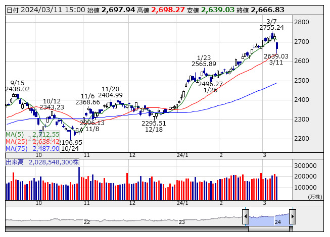 2024年03月11日15時17分 【市況】TOPIX先物:11日清算値=64ポイント安、2642.5ポイント TOPIX <日足> 「株探」多機能チャートより 11日15時15分、TOPIX先物期近2024年6月限は前週末清算値比64ポイント安の2642.5ポイントで取引を終えた。出来高は9万1124枚だった。この日のTOPIXの現物終値2666.83ポイントに対しては24.33ポイント安。 株探ニュース