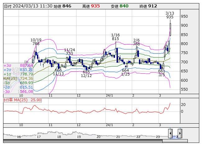 Gunosy <日足> ボリンジャー/カイリ率 「株探」多機能チャートより●株価が+3σを上回った銘柄(市場人気順) ★株価の上げ足が速過ぎ、売りが出やすい銘柄