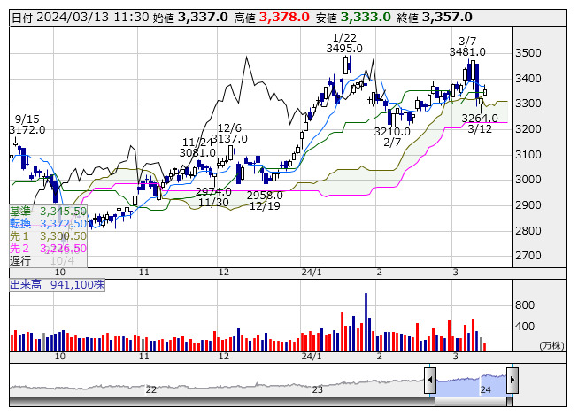 3)株価が均衡表の「雲(抵抗帯)」を上回る