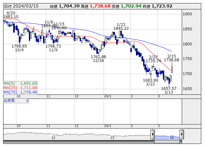 2024年03月18日08時53分 【市況】東証REIT指数先物:18日寄り付き=9ポイント高、1724.5ポイント REIT指数 <日足> 「株探」多機能チャートより 18日8時52分、東証REIT指数先物期近2024年6月限は前週末清算値比9ポイント高の1724.5ポイントで寄り付いた。前週末の東証REIT指数の現物終値1723.92ポイントに対しては0.58ポイント高。 株探ニュース