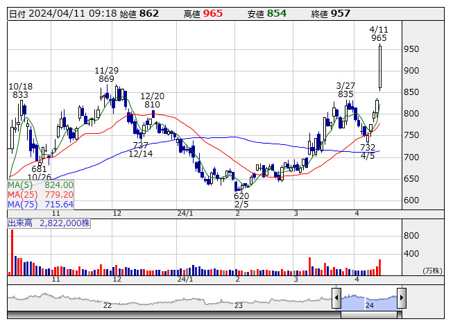 年初来高値。24年8月期の営業利益予想を従来の15.84億円から21.49億円(前期実績9.76億円)に上方修正している。好調な部品販売に加え、国内電子部品業界向けのFA装置案件の一部が前倒しで計上されるため。利益率の高い部品販売の増加や仕入コスト、現地作業費の原価低減も利益を押し上げる見通し。第2四半期累計(23年9月-24年2月)は前年同期比192.3%増の6.56億円で着地し、会社計画(3.63億円)を上回った。