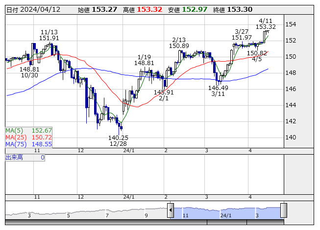 今週のドル・円は堅調。1990年以来、34年ぶりとなる153円39銭までドル高円安が進行した。4月10日発表の3月米消費者物価指数(CPI)は前年同月比+3.5%と、インフレ率は2月実績を上回り、インフレ持続によって米国の利下げ開始時期は7月以降になるとの見方が広がったことが要因。日本政府による為替介入が警戒されたものの、1ドル=152円を超えた後も円安是正のための為替介入は実施されていないこともドル買い・円売りを促す一因となった。中東情勢の緊迫化を警戒したリスク回避的な円買いが観測されたが、ドル高円安の流れが変わることはなかった。12日の東京市場でドル・円は一時153円39銭まで買われた。