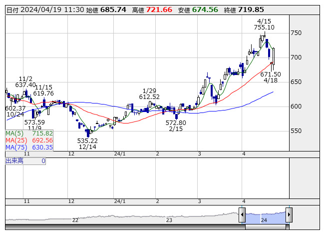 鉱業 <日足> 「株探」多機能チャートより●東証33業種 値上がり: 3 業種 値下がり: 30 業種