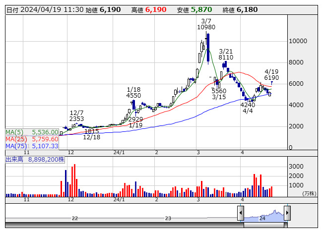 さくらネット <日足> 「株探」多機能チャートよりさくらインターネット<3778>が一時ストップ高の水準となる前営業日比1000円高の6190円に買われた。19日付の日本経済新聞朝刊が「経済産業省は人工知能(AI)を開発する際に使うスーパーコンピューターの国内整備に乗り出す」と報じた。さくらネットなど5社のAIスパコンの整備に合計725億円を補助するという。これを受けさくらネットは19日の取引開始前に、「報道の通り最大補助額約500億円の申請を行っている」とするコメントを発表。申請結果が公表できるタイミングとなった段階で改めて開示する姿勢を示した。経産省の補助による収益押し上げ効果を期待した買いが入った。報道では補助対象に内定した企業として、上場企業ではさくらネットのほか、KDDI<9433>とGMOインターネットグループ<9449>の名を挙げている。支援額はKDDIが102億円、さくらネットが501億円、GMOは19億円としている。