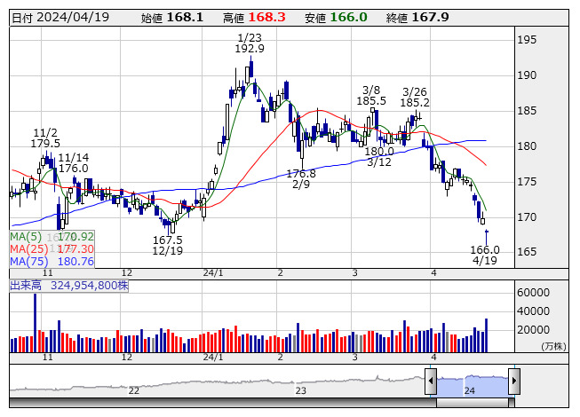 NTT <日足> 「株探」多機能チャートより(東証上場 4248 銘柄対象[ETF、REIT含む])