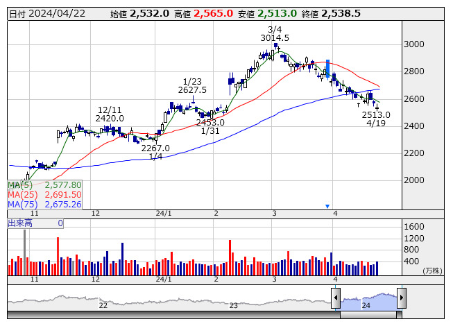 テルモ <日足> 「株探」多機能チャートより4月22日9時03分35秒現在、特別買い気配は63銘柄、特別売り気配は25銘柄となっている。