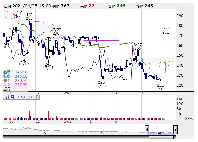 【テク】本日の【均衡表 《雲》|上抜け/下抜け】引け 上抜け= 41 銘柄 下抜け= 243 銘柄 (4月25日)