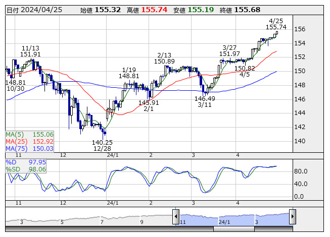 米ドル/円 <日足> Slowストキャス 「株探」多機能チャートより欧州市場でドル・円は一時155円70銭台に浮上したが、上昇一服となり155円60銭台で推移する。ドル買い・円売りの基調は継続し、156円を目指す展開とみられる。ただ、日本政府は円安けん制を繰り返し、為替介入を見極めようと積極的に動きづらい。