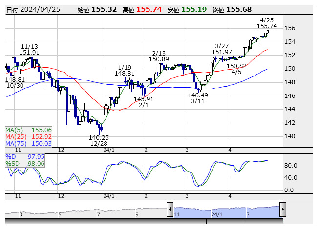 2024年04月25日19時01分 【通貨】外為:1ドル155円63銭前後と横ばい圏で推移 米ドル/円 <日足> Slowストキャス 「株探」多機能チャートより 25日の外国為替市場のドル円相場は午後7時時点で1ドル=155円63銭前後と、午後5時時点に比べ1銭のドル高・円安と横ばい圏。ユーロ円は1ユーロ=166円91銭前後と11銭のユーロ高・円安で推移している。 株探ニュース