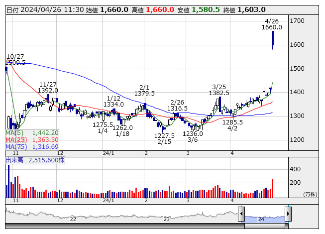 ■日本ゼオン <4205> 1,603円 +188.5 円 (+13.3%) 11:30現在 東証プライム 上昇率3位