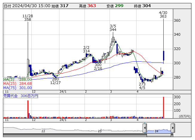 11. <4824> メディアS 318 ( 0.0%) 307 ( 15.3倍)