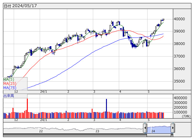 【市況】米国市場データ NYダウは134ドル高で史上初の4万ドル台 (5月17日)