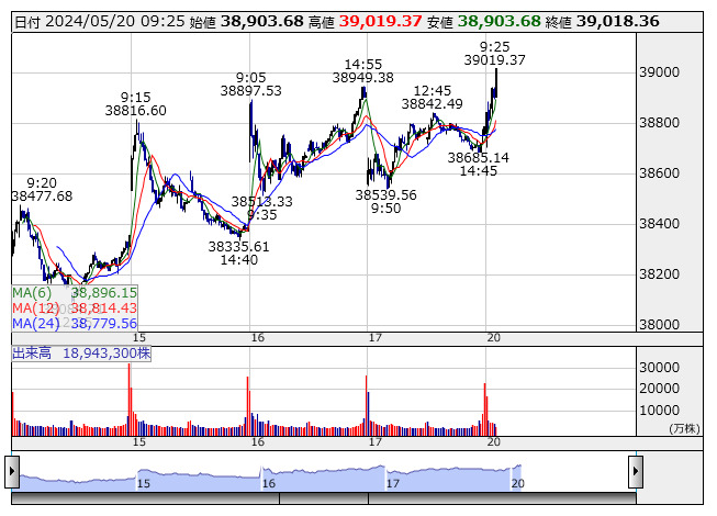 2024年05月20日09時28分 【市況】日経平均がおよそ1ヵ月ぶり3万9000円台回復 日経平均 <5分足> 「株探」多機能チャートより 日経平均株価が4月15日以来、およそ1ヵ月ぶりに3万9000円台を回復した。09時27分現在、231.99円高の3万9019.37円まで上昇している。 株探ニュース