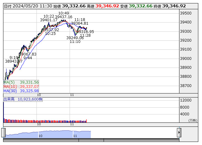 【市況】日経平均20日前引け=反発、559円高の3万9346円