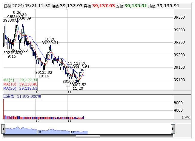 【市況】日経平均21日前引け=続伸、66円高の3万9135円