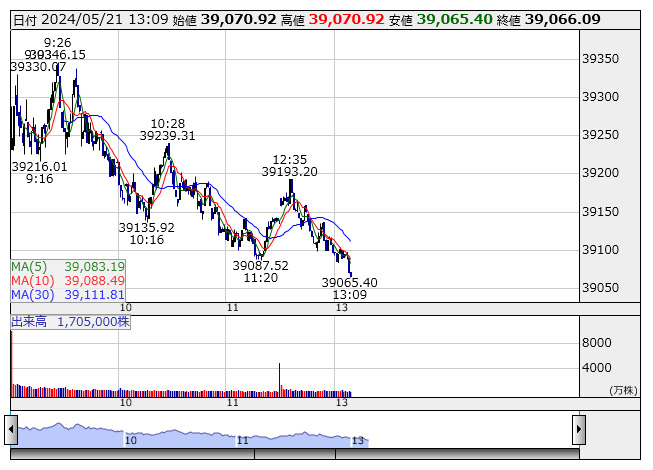 2024年05月21日13時10分 【市況】日経平均がマイナス転換 日経平均 <1分足> 「株探」多機能チャートより 日経平均株価がマイナス転換。13時9分現在、4.28円安の3万9065.4円まで下落している。 株探ニュース