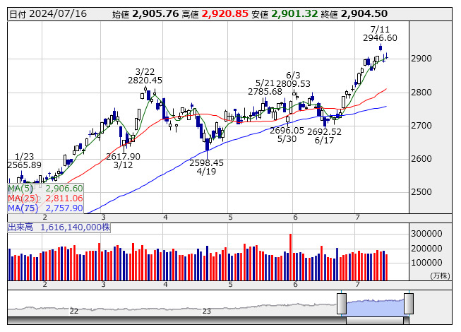 2024年07月17日08時46分 【市況】TOPIX先物:17日寄り付き=25ポイント高、2930ポイント TOPIX <日足> 「株探」多機能チャートより 17日8時45分、TOPIX先物期近2024年9月限は前日清算値比25ポイント高の2930ポイントで寄り付いた。前日のTOPIXの現物終値2904.5ポイントに対しては25.50ポイント高。夜間取引の終値2928ポイントに対しては2ポイント高となっている。 株探ニュース