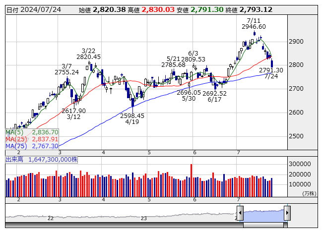 2024年07月25日08時46分 【市況】TOPIX先物:25日寄り付き=43.5ポイント安、2749.5ポイント TOPIX <日足> 「株探」多機能チャートより 25日8時45分、TOPIX先物期近2024年9月限は前日清算値比43.5ポイント安の2749.5ポイントで寄り付いた。前日のTOPIXの現物終値2793.12ポイントに対しては43.62ポイント安。夜間取引の終値2746ポイントに対しては3.5ポイント高となっている。 株探ニュース