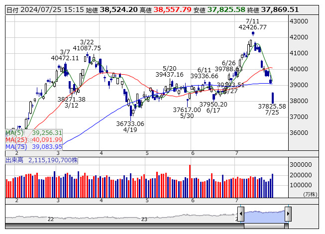 日経平均 <日足> 「株探」多機能チャートよりPTS市場全体、および日経平均構成銘柄の25日終値比の上昇率・下落率ランキングは以下のとおり。