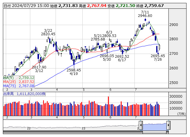 2024年07月29日15時17分 【市況】TOPIX先物:29日清算値=52ポイント高、2752.5ポイント TOPIX <日足> 「株探」多機能チャートより 29日15時15分、TOPIX先物期近2024年9月限は前週末清算値比52ポイント高の2752.5ポイントで取引を終えた。出来高は6万605枚だった。この日のTOPIXの現物終値2759.67ポイントに対しては7.17ポイント安。 株探ニュース