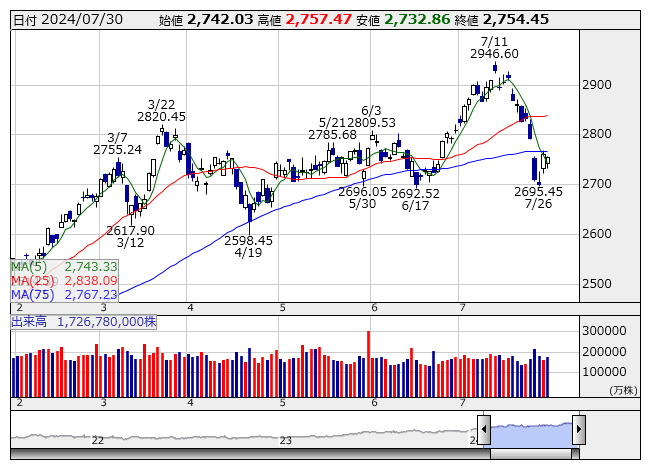 2024年07月31日08時46分 【市況】TOPIX先物:31日寄り付き=21ポイント安、2730ポイント TOPIX <日足> 「株探」多機能チャートより 31日8時45分、TOPIX先物期近2024年9月限は前日清算値比21ポイント安の2730ポイントで寄り付いた。前日のTOPIXの現物終値2754.45ポイントに対しては24.45ポイント安。夜間取引の終値2731.5ポイントに対しては1.5ポイント安となっている。 株探ニュース