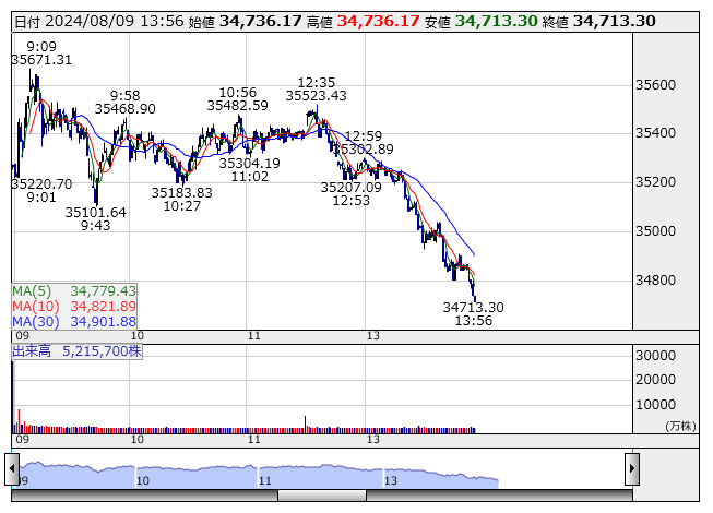 2024年08月09日13時57分 【市況】日経平均の下げ幅が100円を超える 日経平均 <1分足> 「株探」多機能チャートより 日経平均株価の下げ幅が100円を超えた。13時56分現在、102.54円安の3万4728.61円まで下落している。 株探ニュース
