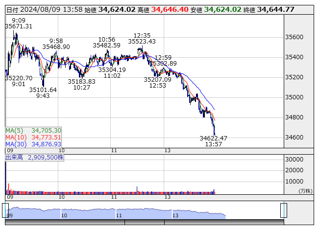 2024年08月09日13時59分 【市況】日経平均の下げ幅が200円を超える 日経平均 <1分足> 「株探」多機能チャートより 日経平均株価の下げ幅が200円を超えた。13時58分現在、208.68円安の3万4622.47円まで下落している。 株探ニュース
