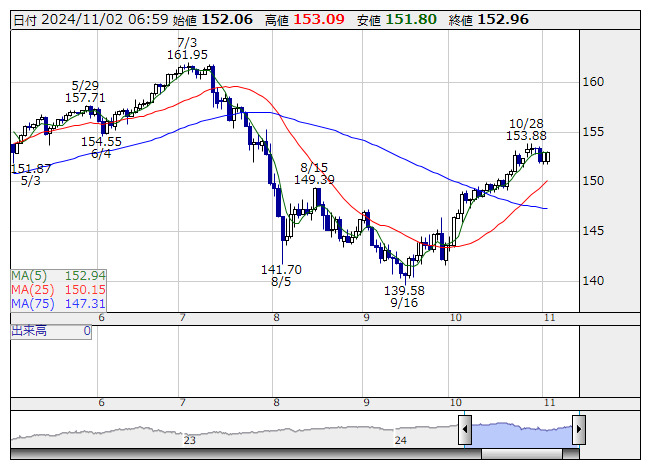 11月1日のニューヨーク外為市場でドル・円は151円79銭まで下落後、153円09銭まで反発した。この日発表された10月米雇用統計で非農業部門雇用者数は市場予想を下回り、8・9月分の増加数は下方改定されたことから、リスク回避のドル売りが広がった。しかしながら、その後発表された10月ISM製造業景況指数の支払価格は大幅に上昇したこと、11月5日に行われる米大統領選挙をにらんで長期金利が上昇に転じたことから、ドルを買い戻す動きが広がった。米ドル・円は152円98銭でこの週の取引を終えた。ドル・円の取引レンジ:151円79銭-153円88銭。