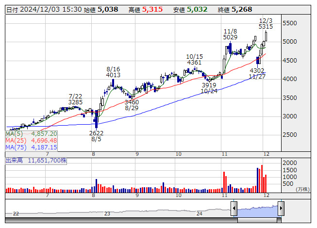 ヘッドウォータース<4011>=5連騰。ここ上げ足を一気に強めている。法人向けにAIを活用したソリューションビジネスやデジタルトランスフォーメーション(DX)導入支援ビジネスなどを展開するが、業容拡大に向けた動きも積極化させている。前週末に株式分割発表を好感されて急騰したが、前日取引終了後には自動車業界向け生成AIサービスを強化する方針を発表、第1弾として車載エッジAIエージェントのラインアップを強化する。車載エッジAIエージェントは、自動車に搭載されたエッジデバイス上でAIを活用し、リアルタイムデータ処理や意思決定を行い、人間の介入なしに特定のタスクを実行する自律型インテリジェントシステムであり、自動運転技術向上に大きく貢献する。これを好感する形で買い人気が集中した。