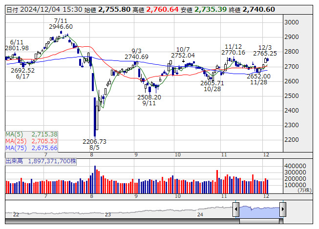 2024年12月04日15時47分 【市況】TOPIX先物:4日清算値=6.5ポイント安、2741.5ポイント TOPIX <日足> 「株探」多機能チャートより 4日15時45分、TOPIX先物期近2024年12月限は前日清算値比6.5ポイント安の2741.5ポイントで取引を終えた。出来高は4万7928枚だった。この日のTOPIXの現物終値2740.6ポイントに対しては0.90ポイント高。 株探ニュース