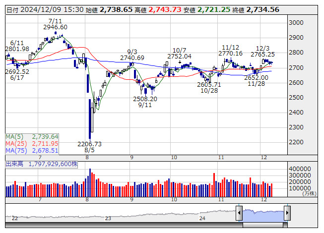 2024年12月09日15時47分 【市況】TOPIX先物:9日清算値=16.5ポイント高、2738ポイント TOPIX <日足> 「株探」多機能チャートより 9日15時45分、TOPIX先物期近2024年12月限は前週末清算値比16.5ポイント高の2738ポイントで取引を終えた。出来高は4万6779枚だった。この日のTOPIXの現物終値2734.56ポイントに対しては3.44ポイント高。 株探ニュース