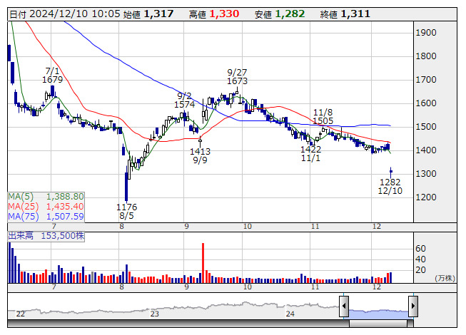 3180>が急落している。9日の取引終了後に発表した25年4月期第2四半期累計(5~10月)の連結決算は、売上高が前年同期比12.8%増の161億8300万円、最終利益が同16.2%減の4億4200万円となった。大幅な増収となった売上高は計画に対しては下振れして着地した。営業・経常・最終利益も計画を下回っており、嫌気されたようだ。店舗設計事業は8~10月期は回復傾向となったが、物販事業で人材派遣費用が増加。ディストリビューションセンターの開設準備費用も発生し、利益を押し下げる要因となった。
