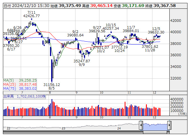 日経平均 <日足> 「株探」多機能チャートより日本取引所が公表した先物手口情報によると、12月10日の日経225ミニ期近(2024年12月限)の夜間取引(立会内・J-NETの合算)で、取引高トップはABNクリアリン証券の16万540枚だった。