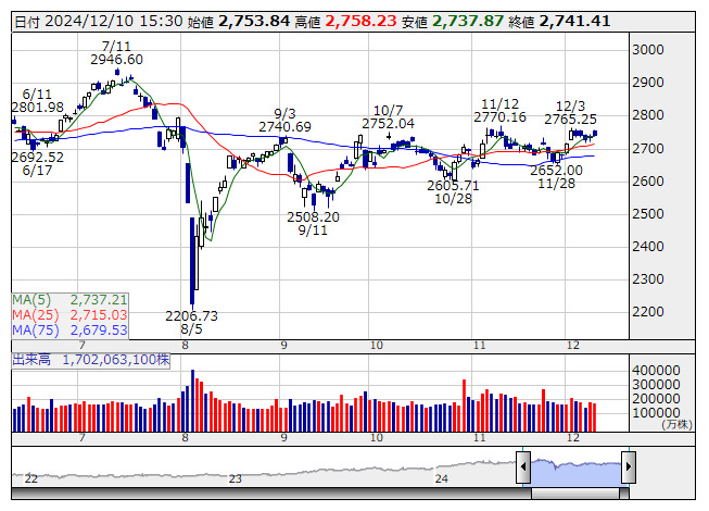 TOPIX <日足> 「株探」多機能チャートより日本取引所が公表した先物手口情報によると、12月10日のTOPIX先物期近(2024年12月限)の日中取引(立会内・J-NETの合算)で、取引高トップはみずほ証券の8万903枚だった。