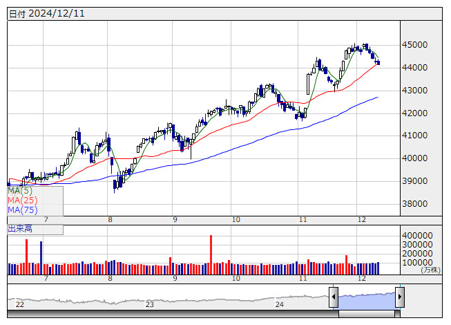 NYダウ <日足> 「株探」多機能チャートより13日の日本株市場は、やや売り先行で始まった後は、底堅さが意識される相場展開になりそうだ。12日の米国市場はNYダウが234ドル安、ナスダックは132ポイント安だった。11月の卸売物価指数(PPI)が市場予想を上回った。前日の米消費者物価指数(CPI)が予想と一致していたこともあり、インフレ懸念が再燃する形から売りが優勢となった。ただし、米連邦公開市場委員会(FOMC)での追加利下げへの見方がコンセンサスとなるなか、下値の堅さは意識された。シカゴ日経225先物(3月)清算値は大阪比145円安の39665円。円相場は1ドル152円50銭台で推移している。