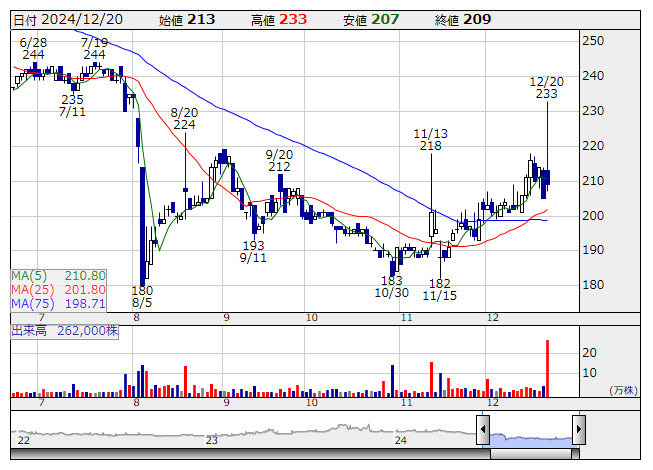 ランビジネス <日足> 「株探」多機能チャートより12月20日の大引け後に決算を発表した銘柄のなかから、業績好調や配当増額など市場で評価される可能性の高い銘柄を取り上げた。