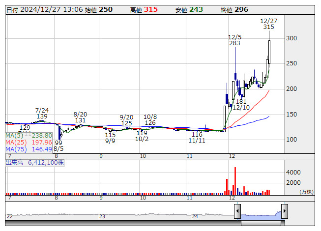 2024年12月27日13時05分 【材料】岡本硝子は後場切り返す、ガラス偏光子の生産能力増強へ 岡本硝子 <日足> 「株探」多機能チャートより 岡本硝子<7746>は後場切り返し、プラスに転じている。正午ごろ、世界的なデータセンター建設の加速化などによるガラス偏光子の受注拡大への対応として、生産能力を増強すると発表した。これまで1ラインで生産していたが、新たに1ライン設けることで生産能力を倍増させる。投資時期は2025年度で投資金額は1億円を予定している。これが好感され買われている。 出所:MINKABU PRESS