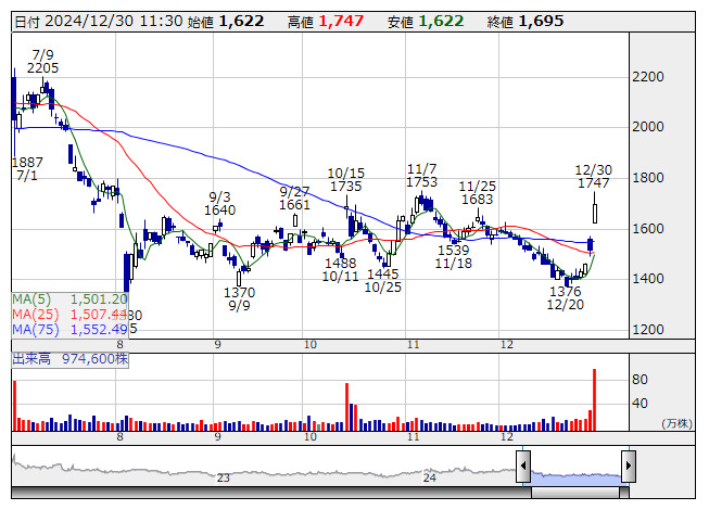マルマエ <日足> 「株探」多機能チャートより主力の半導体分野で、顧客の在庫調整が進展したことから受注が9月以降急拡大していることに加え、新規顧客からの受注も拡大した。また、FPD分野でもIT機器向けG8 OLED向けの設備投資が継続した。