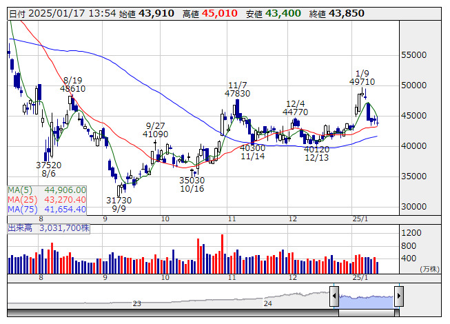 ディスコ <日足> 「株探」多機能チャートより■1月20日~24日の決算発表銘柄(予定) ★は注目決算
