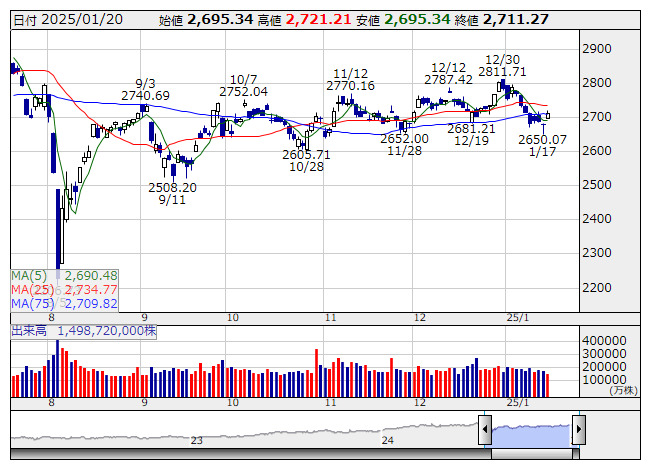 2025年01月21日08時46分 【市況】TOPIX先物:21日寄り付き=8ポイント高、2723ポイント TOPIX <日足> 「株探」多機能チャートより 21日8時45分、TOPIX先物期近2025年3月限は前日清算値比8ポイント高の2723ポイントで寄り付いた。前日のTOPIXの現物終値2711.27ポイントに対しては11.73ポイント高。 株探ニュース