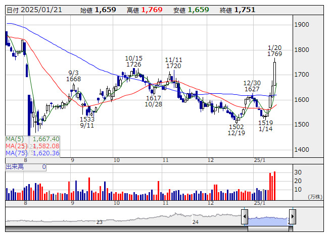 20日に発表した「12月売上高は34.7%増」が買い材料。