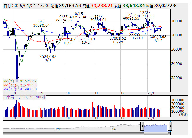 日経平均 <日足> 「株探」多機能チャートより日本取引所が公表した先物手口情報によると、1月21日の日経225ミニ期近(2025年2月限)の夜間取引(立会内・J-NETの合算)で、取引高トップはABNクリアリン証券の6273枚だった。