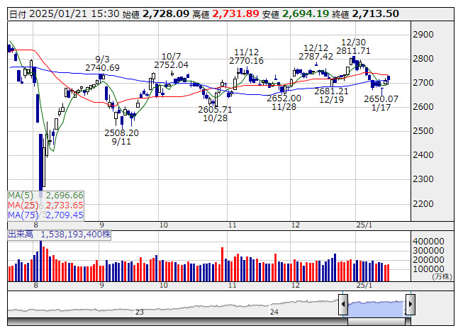 TOPIX <日足> 「株探」多機能チャートより日本取引所が公表した先物手口情報によると、1月21日のTOPIX先物期近(2025年3月限)の日中取引(立会内・J-NETの合算)で、取引高トップはABNクリアリン証券の1万9083枚だった。