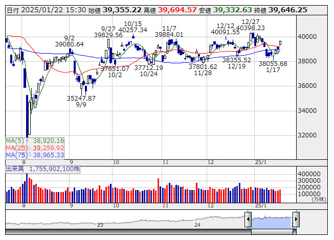 日経平均 <日足> 「株探」多機能チャートより日本取引所が公表した先物手口情報によると、1月22日の日経225ミニ期近(2025年2月限)の日中取引(立会内・J-NETの合算)で、取引高トップはABNクリアリン証券の1万2291枚だった。