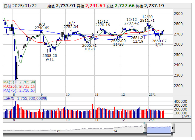 2025年01月23日08時46分 【市況】TOPIX先物:23日寄り付き=8.5ポイント高、2745ポイント TOPIX <日足> 「株探」多機能チャートより 23日8時45分、TOPIX先物期近2025年3月限は前日清算値比8.5ポイント高の2745ポイントで寄り付いた。前日のTOPIXの現物終値2737.19ポイントに対しては7.81ポイント高。 株探ニュース