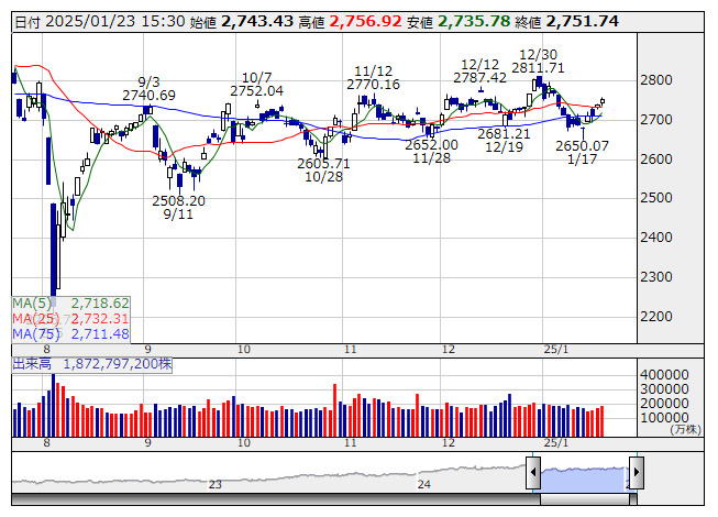 2025年01月23日15時47分 【市況】TOPIX先物:23日清算値=14.5ポイント高、2751ポイント TOPIX <日足> 「株探」多機能チャートより 23日15時45分、TOPIX先物期近2025年3月限は前日清算値比14.5ポイント高の2751ポイントで取引を終えた。出来高は3万2949枚だった。この日のTOPIXの現物終値2751.74ポイントに対しては0.74ポイント安。 株探ニュース