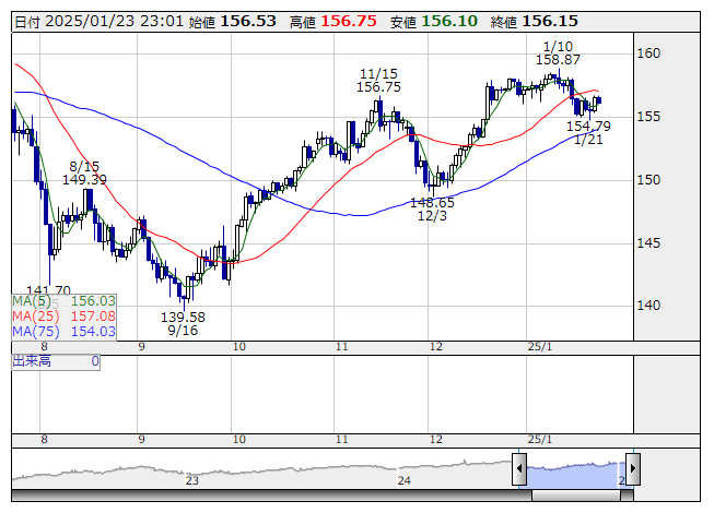 米国債相場は下げ止まり。10年債利回りは4.62%で推移した。ドル買いも後退。ドル・円は156円40銭から156円10銭まで下落。ユーロ・ドルは1.0397ドルから1.0411ドルまで上昇。ポンド・ドルは1.2310ドルから1.2330ドルへ強含んだ。